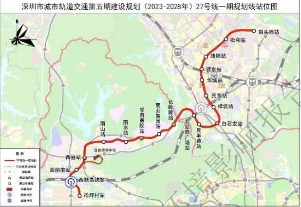 地铁27号线一期起自松坪村站,终至岗头西站,线路全长约23.2公里,设站19座,全部为地下敷设。27号线一期为服务科技园、西丽、龙华的普速线路,强化沿线人口岗位密集区的轨道交通服务,支持坂雪岗科技城、深圳北站中心、南山科技园等重点片区发展,服务西丽枢纽客流集疏运。
