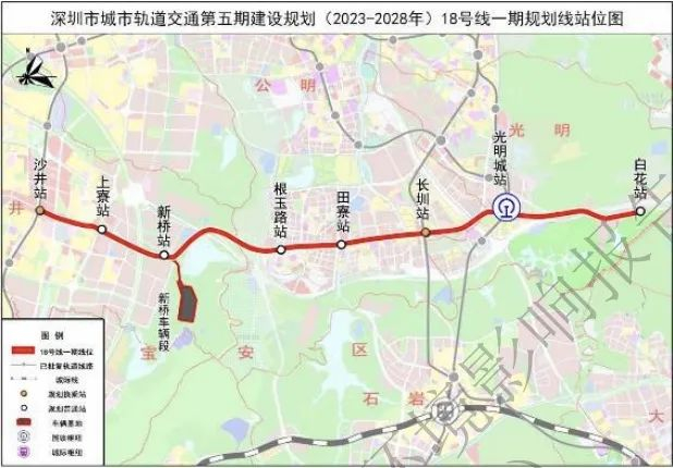 地铁18号线一期起于沙井终至光明区白花站,全线长约18.7公里,设站8座,线路全线均采用地下敷设方式。18号线一期为服务宝安北部中心、光明的轨道快线,强化外围中心快速联系,支持宝安新桥东、光明玉塘、光明凤凰等先进制造业园区发展,服务光明城枢纽客流集散。