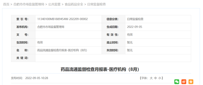 填报单位:合肥市市场监督管理局药品监管处 统计时间:2022年8月31日