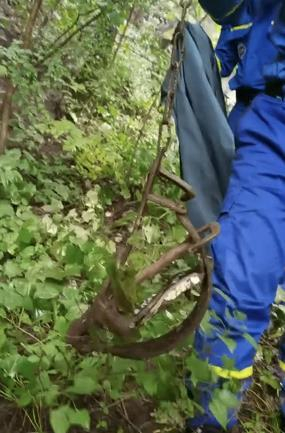 獾被困住的地方有一条山沟,沟里有水,石头上到处是湿漉漉的青苔,走在上面特别湿滑。由于这只獾在痛苦挣扎,地上到处是獾爪挠出的痕迹,如何施救也让队员们颇费一番脑筋。