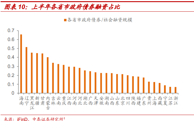 政府债券对经济欠发达地区推动力逐渐增强。从各省市政府债券在新增社融规模中的占比来看,海南(65.7%)、辽宁(51.5%)、黑龙江(45.2%)、新疆(44.8%)、甘肃(44.3%)、内蒙古(40.1%)、吉林(34.2%)、云南(32.8%)等经济欠发达地区占比均超过三分之一,政府债券对的欠发达地区推动力逐渐增强;而浙江(7.0%)、江苏(7.1%)等经济发达地区对政府债券的依赖程度则相对较低。