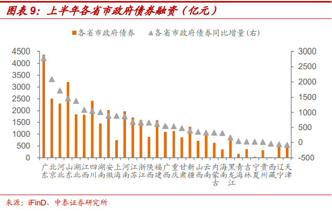 地区新增社融同比增速改善,主要得益于去年低基数。上半年全国25省市实现新增社融同比增速正增长,主要得益于去年同期低基数—仅有两市同比实现正增。分省份来看,宁夏、山西和海南增速超100%,领跑全国。比较来看,三地受到基数较低叠加不同分项目的综合影响:宁夏主要靠人民币贷款拉动;山西企业债券净融资强劲;海南源于政府债券净融资拉动。大幅下滑地区更加值得关注,吉林、青海连续两年社融大幅下滑,融资压力较大。