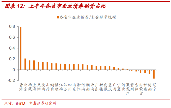 从各省市新增企业债券在新增社融规模中的占比来看,青海排名全国首位,但主要原因为企业债券与社融均为负增,故而参考意义不大。排除后,排名前四省份为北京(20.7%)、西藏(17.4%)、上海(17.3%)、天津(14.7%)。可以看出,北京、上海、天津3直辖市引领了全国企业债券对社融拉动潜力的进一步释放。