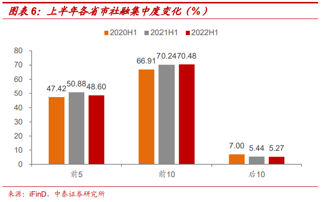 地区社融“强者越强”态势有所缓解。地区社融集中度显示,排名前五的广东、江苏、浙江、山东、四川五省市新增社融规模合计占比48.6%,较去年同期下降2.3个百分点,“强者越强”态势衰退;排名前十省市占比较去年同期提高0.2个百分点至70.5%,排名后十省市占比下降0.17个百分点至5.3%,“强者越强”态势有所减缓。