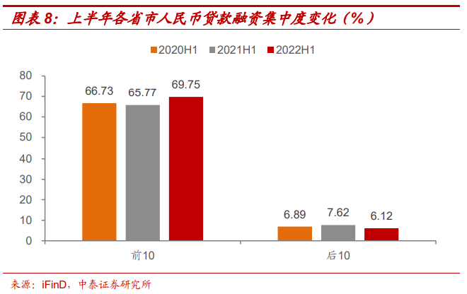 集中度表明,上半年排名前十省市新增人民币贷款规模合计占全国总量的69.8%,较去年同期上升近4.0个百分点,而排名后十省市占比则下降1.5个百分点至6.1%,反映出上半年人民币资源向信贷增长优势地区持续聚集,信贷不平衡问题有所加剧。