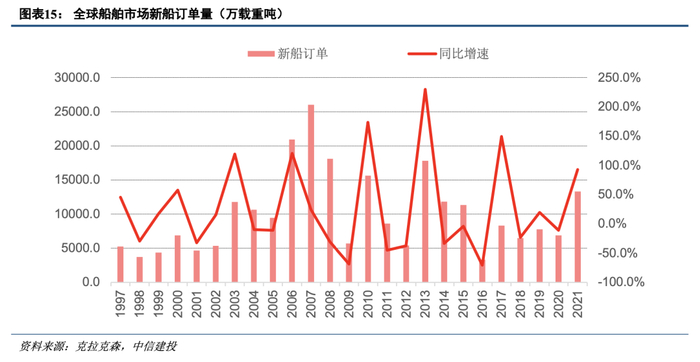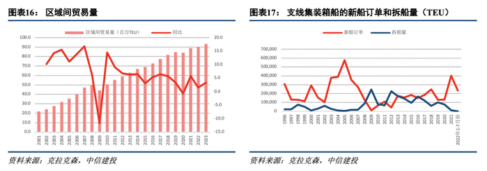 支线集装箱船作为小型集装箱船主要的应用市场为亚洲区域航线和欧洲区域航线,亚洲和欧洲区域经济持续活跃,为区域航运市场带来不断新增的海运需求。2021年,亚洲区域集装箱船需求为6360万TEU,同比增长7%,预计2022-2023年仍将增长3.1%、4.2%,显示出在后疫情时代,亚洲区域仍然富有经济活力,并带动区域间贸易和海运量持续维持较高水平的增长。区域间贸易的繁荣将持续拉动支线集装箱船的需求,目前支线集装箱船平均年龄达到15年,未来拆解后的更新需求也将支撑支线集装箱船新船需求。