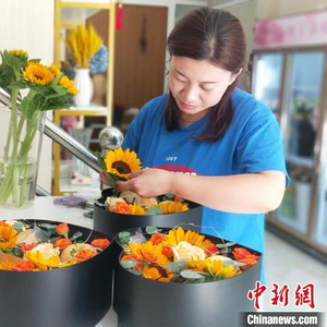 花卉销售点工作人员在制作鲜切花礼品盒。赵国华摄