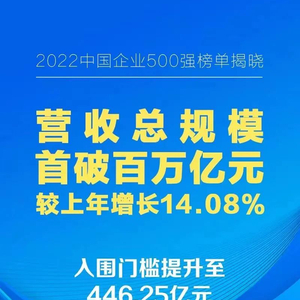 中国企业联合会、中国企业家协会9月6日发布“2022中国企业500强”榜单,今年500强的入围门槛为446.25亿元,较上年提高53.89亿元,增长13.74%;500强企业2021年营收总规模首次突破100万亿元大关,达到102.48万亿元,较上年增长14.08%,为近10年来的最大涨幅。