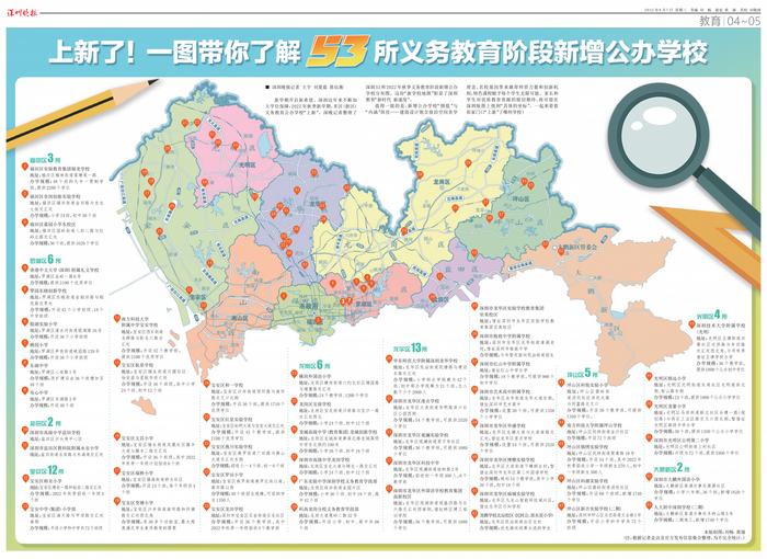 新学期开启新希望。深圳近年来不断加大学位保障,2022年秋季新学期,多区(新区)义务教育公办学校“上新”。记者整理了深圳53所2022年秋季义务教育阶段新增公办学校分布图。这份“新学校地图”彰显了深圳教育“新时代 新速度”。