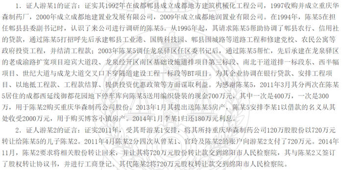 2019年1月2日,中国裁判文书网发布的《陈争鸣受贿罪一审刑事判决书》显示,经审理查明,1995年至2012年期间,陈某5利用担任郫县县委副书记、郫县县委书记、成都市龙泉驿区区委书记、成都经开区党工委书记、成都市市长助理的职务之便,为成都地方建筑机械化工程公司和成都地润置业发展公司在成都市郫县成都现代工业港工程项目、今日花园房地产项目、博客小镇等项目的取得、推进、融资、结算等方面提供帮助,分三次收受公司法定代表人游某1人民币2520万元,用于购买重庆华森制药有限公司价值720万元的股份和博客小镇价值1702.50万元的房产。案发后,陈某5之子陈某2将涉案股份归还重庆华森制药有限公司股东游某2,游某2代其将720万元上缴侦查机关。