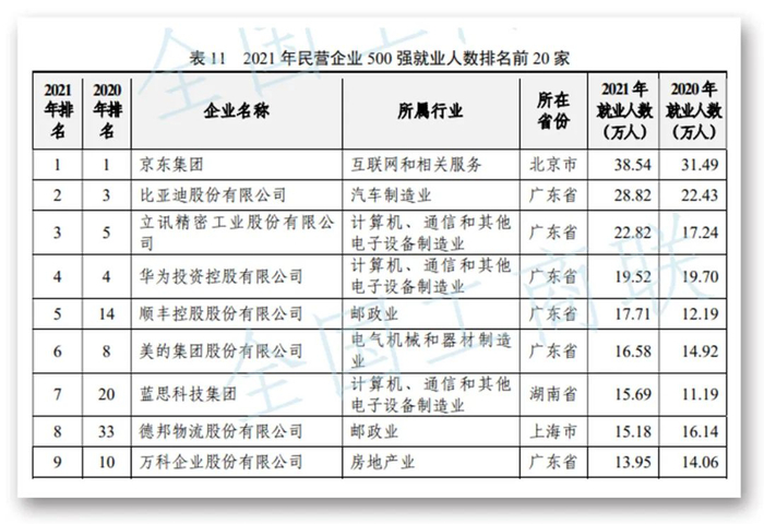 民营企业500强就业总数1094.15万人,占全国就业人员的1.47%。其中,京东集团就业人数连续两年最多,达38.54万人。