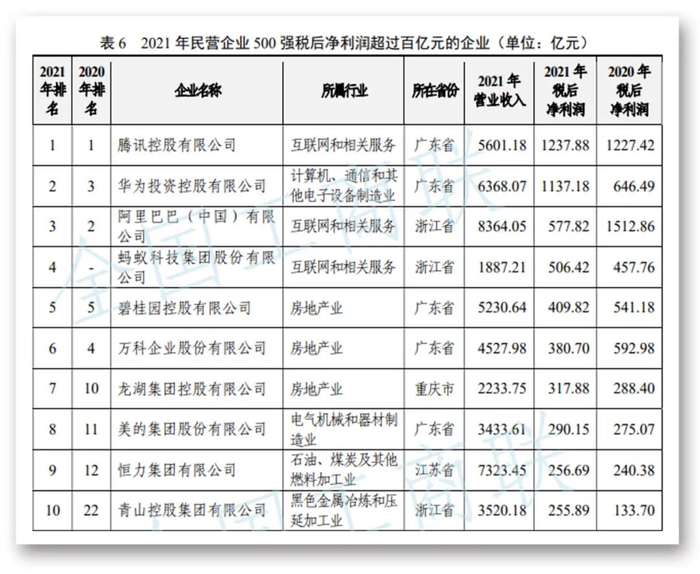 榜单显示,2021年民营企业500强税后净利润为17277.93亿元。税后净利润超百亿元的有37家(较上年增加4家)。其中,超过200亿元的企业为腾讯控股有限公司、华为投资控股有限公司、阿里巴巴(中国)有限公司等14家企业。