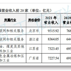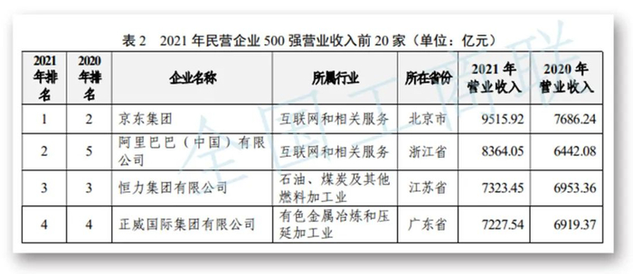 9月7日,全国工商联发布“2022年中国民营企业500强”榜单,位列前三名的企业分别为:京东集团、阿里巴巴(中国)有限公司、恒力集团有限公司。其中,京东集团以9515.92亿元的营业收入规模首次位居民营企业500强榜首。