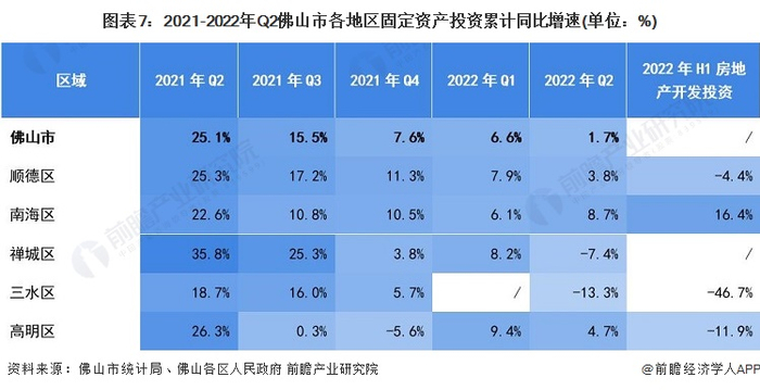 2022年上半年,佛山市固定资产投资同比增长1.7%。分地区来看,南海区固定资产投资增速最快,达8.7%,其中房地产开发投资增速达16.4%;三水区固定资产投资降幅最大,为13.3%,其中房地产开发投资降幅达到了46.7%。