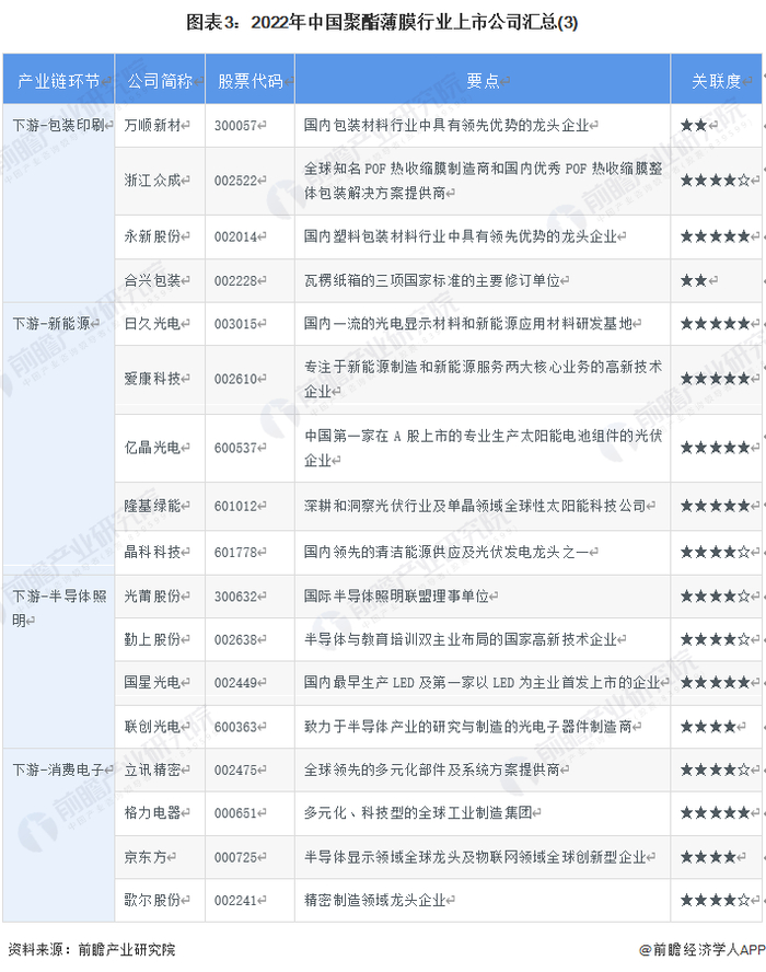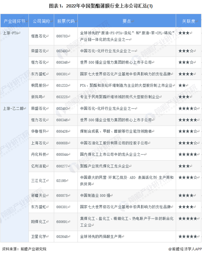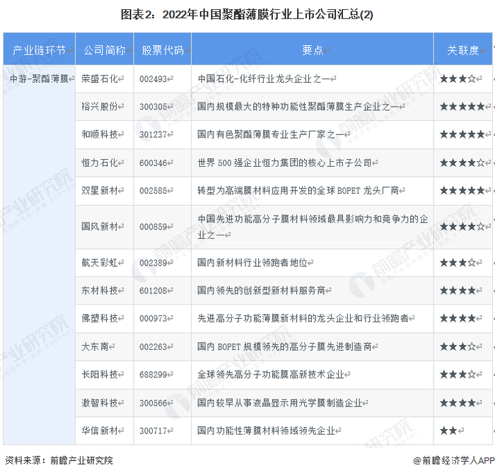 行业主要上市公司:裕兴股份(300305)、和顺科技(301237)、恒力石化(600346)、双星新材(002585)、国风新材(000859)、航天彩虹(002389)、东材科技(601208)、佛塑科技(000973)、大东南(002263)、长阳科技(688299)、激智科技(300566)、华信新材(300717)等
