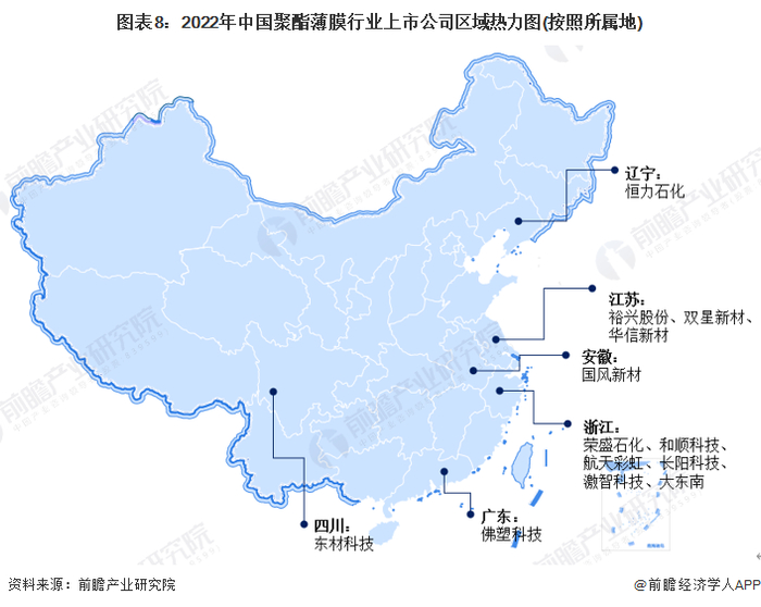 目前,聚酯薄膜行业内现有竞争者主要集中在广东、山东、江苏和浙江等地。其中上市公司主要集中在浙江、江苏、广东、四川、安徽和辽宁等地。