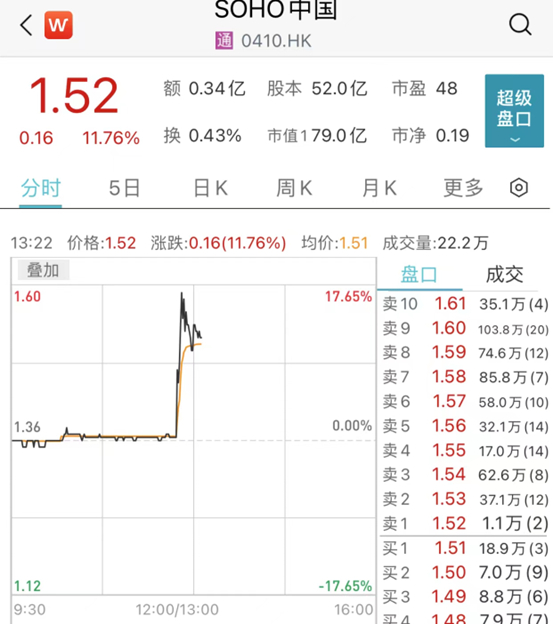 受此消息影响,午后,SOHO中国股价快速拉升,一度涨超17%,截至发稿,SOHO中国股价涨11.76%,报1.52港元/股,市值79亿港元。