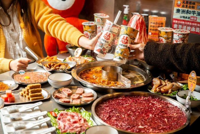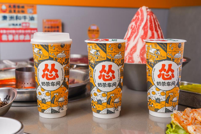 怂重庆火锅厂还有自营的奶茶车间,主推是开心加料奶茶,选用奇兰大红袍拼配茶叶,搭配纯牛奶,共有8种辅料任选,可按喜好免费任选3种搭配,口味完全不输奶茶店。