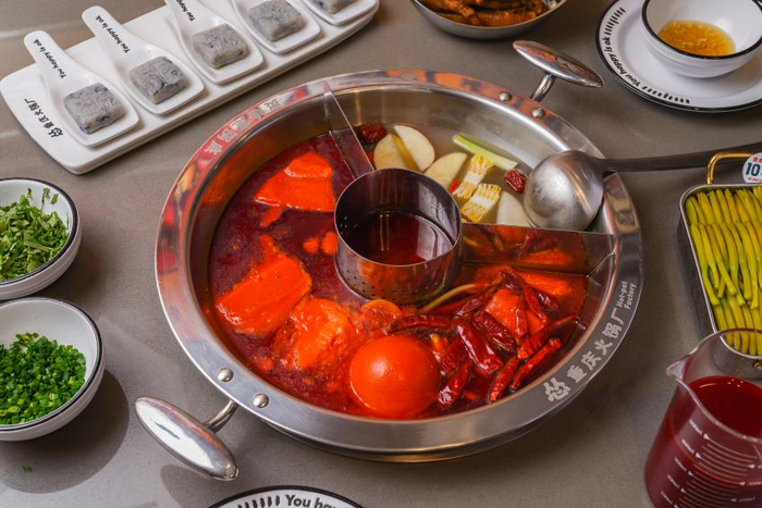 怂重庆火锅厂只卖一款锅底,就是他们的招牌锅底:牛油辣搭果蔬汤。三分之二是牛油辣锅,用的是自家工厂熬制的澳洲和牛油,自家工厂炒的底料,久煮不咸,辣嘴不辣胃;三分之一果蔬骨汤,牛骨汤加入新鲜的水果、蔬菜,清甜温润。