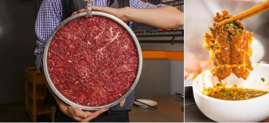 每天新鲜配送的新鲜牛肉,现点现切,只需烫9秒,搭配秘制的鲜牛肉特供酱,咸鲜酸辣,十分过瘾。