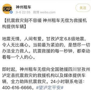 关注四川震情 神州租车无偿提供车辆并推出免费退改政策