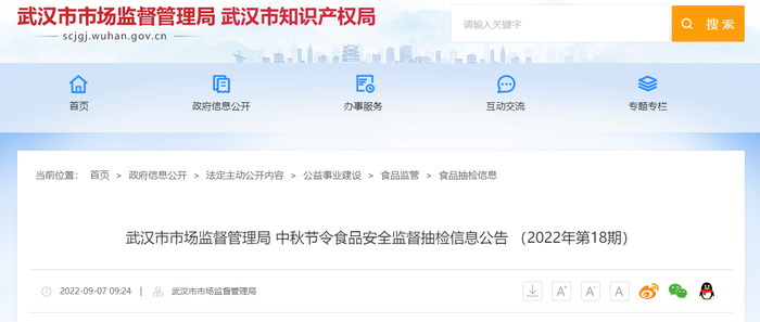 中国质量新闻网讯 2022年9月7日,武汉市市场监督管理局网站发布中秋节令食品安全监督抽检信息公告 (2022年第18期)。