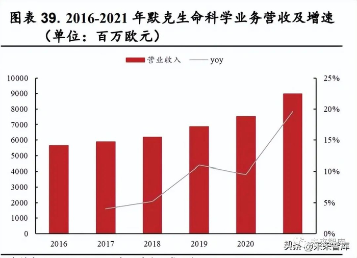 默克成立于 1668 年,迄今已经有超过350 年的历史,在全球约有6万多名员工,2021 年默克全球销售额达到 197 亿欧元。默克专注于医药健康、生命科学和电子科技三大业务板块,涉及领域包括应对癌症和具有挑战性疾病的生物疗法、应用于科学研究和生产的尖端系统以及智能手机和平板电视的液晶材料等。默克旗下拥有六大品牌,包括提供实验室用品及生产材料的 Sigma-Aldrich、提供用于制备、分离、过滤和检测产品的Millipore,以及为制药和生物制药提供 CDMO 服务的BioReliance 等。