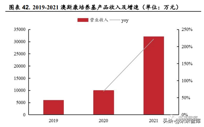 澳斯康成立于 2011 年,主营业务包括细胞培养基的开发、生产和销售,以及生物制品/药品的 CDMO 服务,公司以细胞培养基业务为根基向下游CDMO 延伸,逐渐发展成为生物制药行业的规模化合规生产整体方案提供商。公司培养基业务可以为客户提供目录培养基、个性化培养基定制开发及生产、OEM 培养基生产服务以及细胞培养工艺所需辅料等产品。生物药CDMO 板块可以满足客户从临床前技术开发到商业化生产等各个阶段需求,目前已经帮助 1 个客户项目成功进行商业化生产,此外还有3个项目处于临床三期和上市申报阶段。健顺生物是公司旗下的培养基品牌,成立于2011 年,是国内最早从事细胞培养基开发和生产的企业之一。2019-2021 年,公司培养基业务营业收入分别为 5916 万元、9981 万元和 3.21 亿元,3 年CAGR为132.83%,占主营业务收入比例分别为 68.00%、47.79%和71.80%。公司培养基能够满足蛋白/抗体药企以及人用/兽用疫苗生产企业研发生产需求,并通过FDA的DMF 备案,能满足客户国内外双报需求。目前公司拥有兰州和南通两个培养基生产基地,合计培养基年产能可达数千吨。2021 年公司是国内细胞培养基市场份额排名第一的国产品牌,在所有品牌中排名第三。