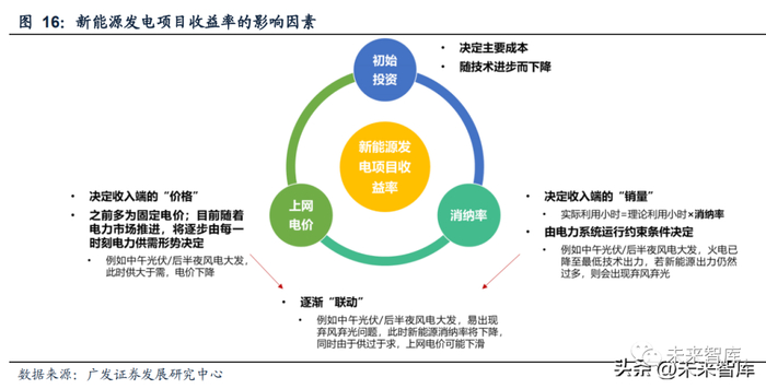 新能源项目收益率主要由三个关键变量决定:一是初始投资,每年产生折旧, 是新能源发电成本的主要组成部分;二是上网电价,决定收入端的“价格”,之前 多为固定电价,目前随着电力市场推进,将逐步由每一时刻电力供需形势决定;三 是消纳率,决定收入端的“销量”,实际利用小时=理论利用小时×消纳率,项目 所在地的理论利用小时大体保持稳定,消纳率成为影响上网电量的主要因素。