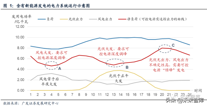 在一日内的不同时刻(后半夜 A 点、正午 B 点、傍晚 C 点)分别对可控电源 出力提出了相反要求,如果可控电源调节能力不足,将难以适应上述相反要求,即 会出现深度调峰能力不足而弃风弃光(A、B 点)或顶峰能力不足而缺电(C 点) 的问题。我国电力系统中煤电占比最高,而煤电启动和关机时间较长,无法实现日 内启停调峰,加之煤电出力调节范围有限,因此电力系统调节将陷入“两难”境地:若要实现新能源充分消纳(A、B 点),则需要减少煤电开机数量,而由于煤电难 以快速启动,因此可控电源顶峰能力或将不足,导致傍晚用电高峰时缺电(C 点);若要实现对用电高峰的充分保供(C 点),则需要增加煤电开机数量,而由于煤电 难以快速关机,则可控电源深度调峰时合计出力将保持较高水平,导致新能源无法 充分消纳(A、B 点)。