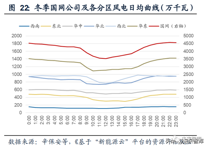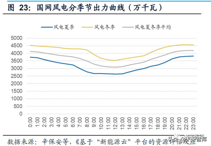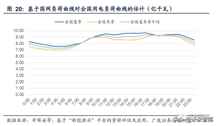 新能源消纳空间由用电负荷曲线、新能源出力曲线、灵活性资源出力曲线三者 的匹配程度决定。基于文献中有关数据开展研究:关于用电负荷曲线:基于《基于“新能源云”平台的资源评估及应用》披露数 据,假设夏季和冬季用电负荷平均值为全年平均用电负荷,测算全年国网经营区用 电量约为60012亿千瓦时。根据对全国及三大电网用电量情况的分析,测算 2020 年国网经营区用电量约为60130亿千瓦时,与上述数据相近,故文献中曲线大概率 为2020年数据。进一步,我们测算2020年国网经营区用电量约为全国用电量80.1%, 假设南网、蒙西电网负荷曲线形状与国网相近,则按上述比例扩展国网负荷曲线得 到 2020 年全国负荷曲线。夏季冬季负荷曲线差异有限,故后续采用全国夏冬季平 均负荷曲线开展简化研究。