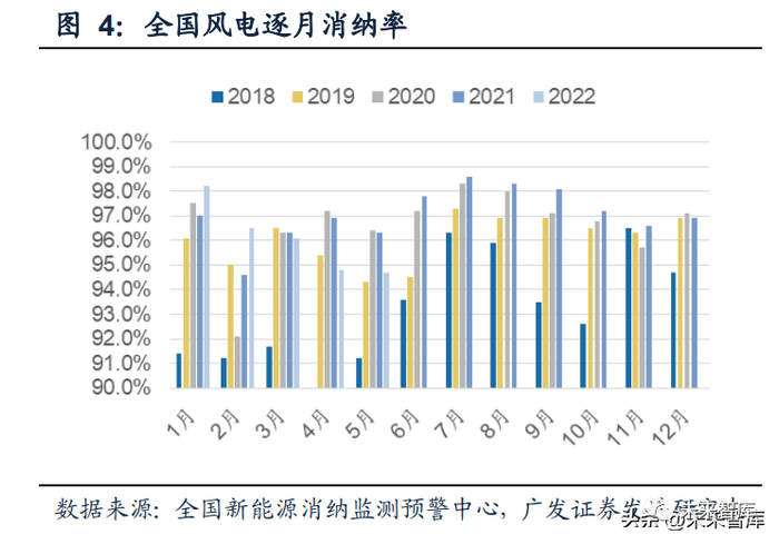 从全国层面看,整体消纳率水平尚可,风电存在一定压力。根据全国新能源消 纳监测预警中心披露数据,2022 年 1-5 月,全国风电累计消纳率 95.6%、光伏累 计消纳率 97.5%。国家发改委、国家能源局在《清洁能源消纳行动计划(2018-2020 年)》中提出,“2020 年,确保全国平均风电利用率达到国际先进水平(力争达到 95%左右),弃风率控制在合理水平(力争控制在 5%左右);光伏发电利用率 高于 95%,弃光率低于 5%”。目前风电消纳率已接近上述目标下界。考虑到今年 风电发电量增速远低于去年同期,且来风较去年偏小(平均累计利用小时同比下滑), 若回归正常水平,风电消纳形势将更加不容乐观。