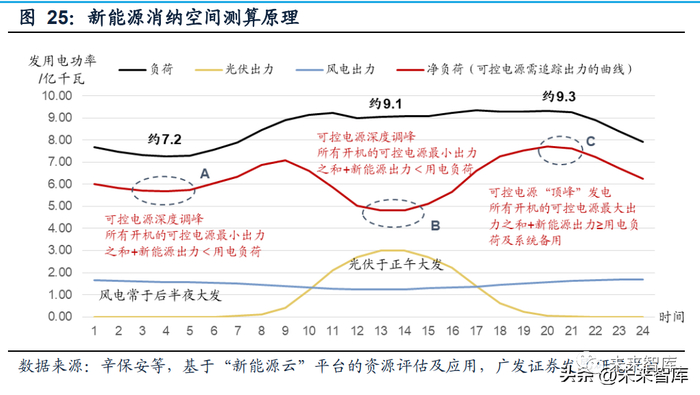 (1)风电常于后半夜大发,此时要求可控电源深度调峰(A 点)。后半夜用 电负荷较低,而风电常常大发,导致净负荷曲线向下“深凹”。此时要求可控电源 尽量下压出力,进行深度调峰,为风电消纳提供空间。(2)光伏于正午大发,此时要求可控电源深度调峰(B 点)。正午虽然是用 电高峰,但是光伏集中发电,仍然导致净负荷曲线向下“深凹”。此时要求可控电 源尽量下压出力,进行深度调峰,为光伏消纳提供空间。