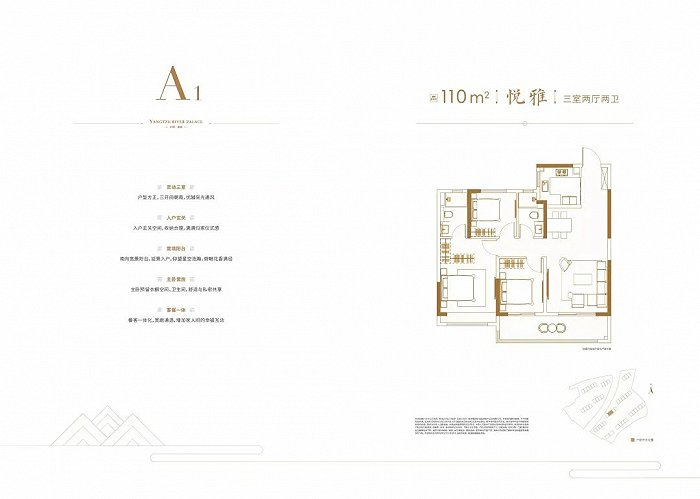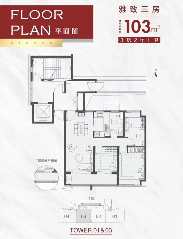 建面约110㎡三房两厅两卫:3开间朝南,约6.6米开间大阳台,主卧套房设计,独立卫生间。