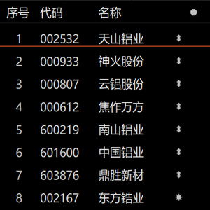 据统计,电解铝涉及的上市公司主要有天山铝业、神火股份、云铝股份、焦作万方、中国铝业、中孚实业、电投能源;氧化铝涉及的上市公司主要有天山铝业、云铝股份、中国铝业、福达合金、明泰铝业;铝土矿涉及的上市公司主要有天山铝业、云铝股份、中国铝业、中色股份。再生铝涉及的上市公司主要有宏创控股、怡球资源、顺博合金、华联综超、福蓉科技、永茂泰。