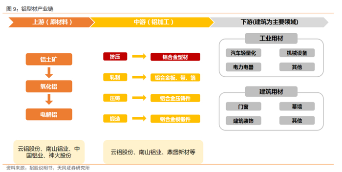 铝加工产业链上游为铝土矿,产生氧化铝后分解出电解铝,电解铝在直流电作用下,发生电化学反应,在阴极析出的金属铝;中游产品主要为铝型材和铝板带箔。铝加工产业链下游应用领域广泛,包括建筑、机械设备、汽车、包装、耐用消费品及锂电池等。
