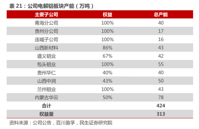 此外,中国铝业为龙头企业,氧化铝产能近1600万吨位居全球第一、原铝产能400万吨左右全球第二。并且,中国铝业的国内铝土矿资源拥有量位居第一,还在海外拥有铝土矿资源18亿吨左右。中国铝业旗下子公司电解铝板块产能合计424万吨。