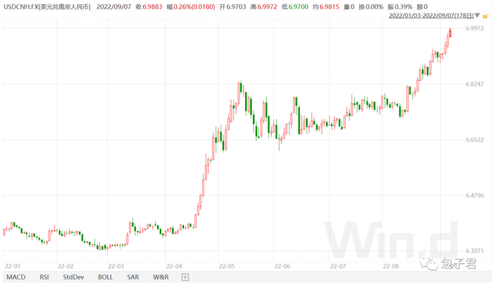 今天离岸美元兑人民币汇率一度到了6.9972,距离破7仅半步之遥。