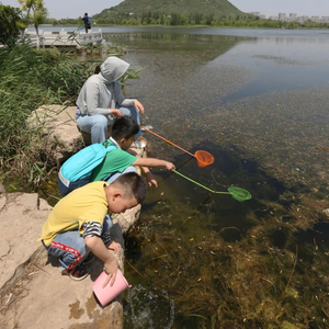 ▲5月22日,家长和小朋友在济南华山历史文化湿地公园捕鱼,而一旁的小朋友则把捕得鱼放生。图/ICphoto