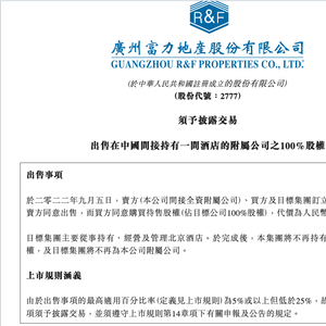 9月5日晚间,富力地产公告显示,其间接全资附属公司广州兆晞投资有限公司,拟向北京英协置业投资有限公司(以下简称“英协置业”)出售广州富京酒店管理有限公司(以下简称“广州富京”)100%股权,代价为5.50亿元。