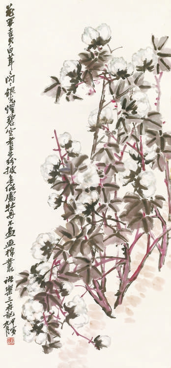 诸乐三痴迷于中国传统艺术,做学问追求在不同领域中的“会通”。他的书法追随吴昌硕的足迹,于苍古浑厚中见雄浑飞动。他对楷、行、草、隶等书体进行了全面研究,尤以篆书和甲骨文为甚。他笔下的花树竹藤,常化作篆、狂草合一的笔法,写出蜿蜒盘郁的姿态。创作于1947年的《瓦雀芭蕉》在恩师吴昌硕的基础上又生发出新意。两只麻雀立在蕉叶之上,一只飞于其间。芭蕉以篆书写其线,点其色,苍郁饱满,绿意盎然。1959年的《桃花》将吴昌硕典型的纵式对角线构图横放过来,以右侧顽石为重心,在中部蔓生出一棵桃树,向上方生长,纷披向左右。另一枝干向左发展,饱满的花朵缀满枝头,并有一枝回旋向右,与顽石呼应。满纸粉红,春意婆娑。而在1974年创作的《棉花》中,诸乐三仍采用吴昌硕最喜爱的对角线结构,题材却换成了老师从未画过的棉花,因此要在色彩的选择上另辟蹊径。诸乐三以紫色染根茎,以掺了紫色的墨汁绘叶片,盛开的棉桃上以蓝色复染轮廓线,反衬花朵的洁白。他在题诗中说:“花开吉贝白茸茸,闪闪银光耀碧空。老笔纷披无俗虑,牡丹不画画棉丛”,确实达到了“闪闪银光”的效果。而牡丹是吴昌硕最为钟爱的题材之一,诸乐三自然对恩师的画法极为熟悉,但他在题材上有意拉开距离,为的是破一下既定的范式,这样才能开拓出新的格局。