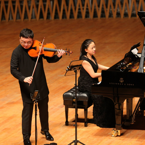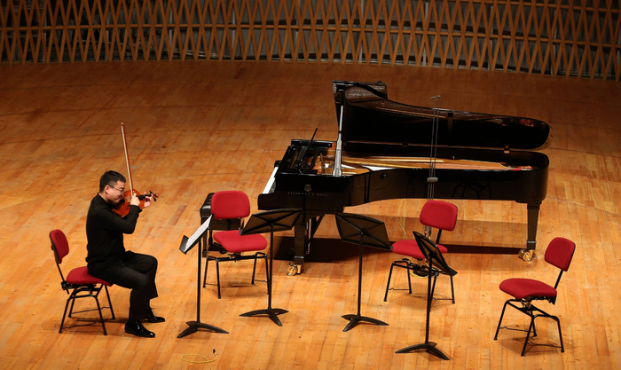 演出现场,梅第扬和钢琴家黄秋宁合奏。 上海交响乐团供图