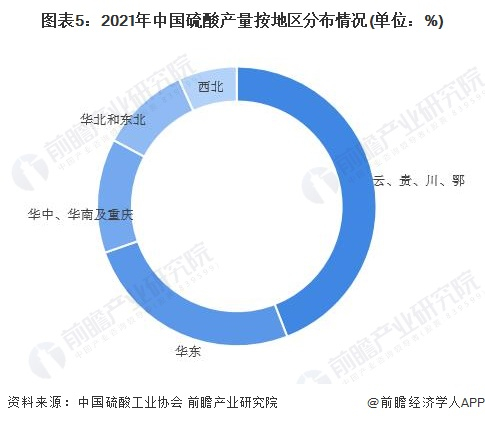 具体到地区来看,我国硫酸产量主要分布在磷复肥产地和工业发达地区,其中云、贵、川、鄂地区和华东工业发达地区是我国硫酸产量主要分布地区。到2021年,云、贵、川、鄂地区硫酸产量为4825万吨,占总产量的44.12%;华东地区产量为2789万吨,占总产量的25.50%。