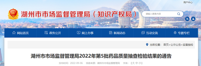 中国质量新闻网讯 2022年9月6日,浙江省湖州市市场监督管理局网站通告2022年第5批药品质量抽查检验结果。