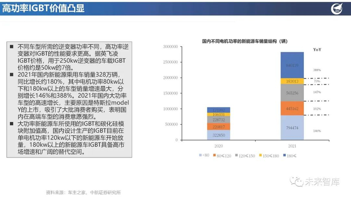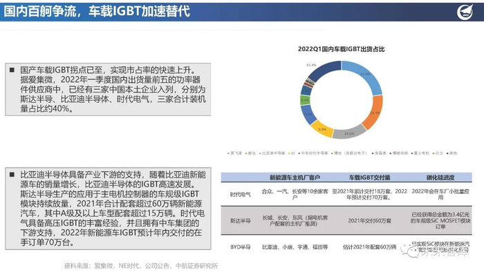 比亚迪半导体具备产业下游的支持,随着比亚迪新能 源车的销量增长,比亚迪半导体的IGBT高速发展。斯达半导生产的应用于主电机控制器的车规级IGBT 模块持续放量,2021年合计配套超过60万辆新能源 汽车,其中A级及以上车型配套超过15万辆。时代电 气具备高压IGBT的丰富经验,并且拥有中车集团的 下游支持,2022年新能源车IGBT预计年内交付的在 手订单70万台。