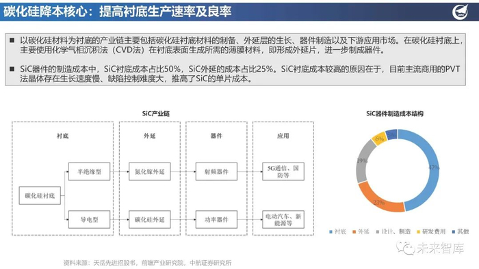 SiC器件的制造成本中,SiC衬底成本占比50%,SiC外延的成本占比25%。SiC衬底成本较高的原因在于,目前主流商用的PVT 法晶体存在生长速度慢、缺陷控制难度大,推高了SiC的单片成本。