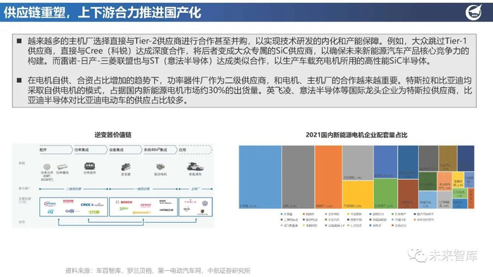 目前国内OEM出于国产化替代,供应链稳定的考量愿意培养自主半导体产业,投资或成立合资公司共同探索车规级半导体 技术和质量达标方案,或者自建模块产线,将品质掌控在自己手中。OEM和Tier供应商对功率模块的设计和制造进行完整 的评价测试和长期管理培养后,将方便采用部分本土的功率芯片,从而在成本控制上找到合适的方案。