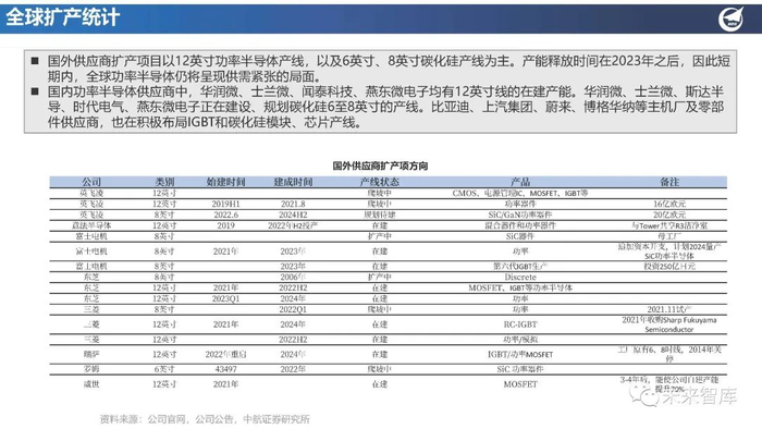 国外供应商扩产项目以12英寸功率半导体产线,以及6英寸、8英寸碳化硅产线为主。产能释放时间在2023年之后,因此短 期内,全球功率半导体仍将呈现供需紧张的局面。