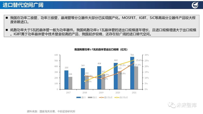 我国在功率二极管、功率三极管、晶闸管等分立器件大部分已实现国产化。MOSFET、IGBT、SiC等高端分立器件产品较大程 度依赖进口。