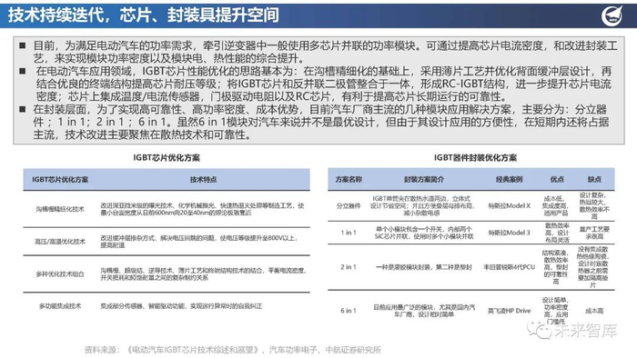 在封装层面,为了实现高可靠性、高功率密度、成本优势,目前汽车厂商主流的几种模块应用解决方案,主要分为:分立器 件 ;1 in 1;2 in 1 ;6 in 1。虽然6 in 1模块对汽车来说并不是最优设计,但由于其设计应用的方便性,在短期内还将占据 主流,技术改进主要聚焦在散热技术和可靠性。